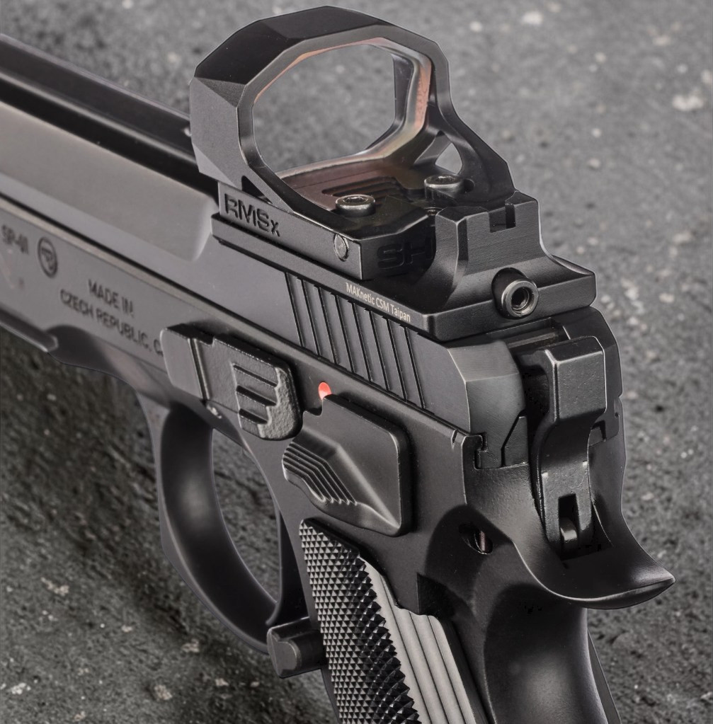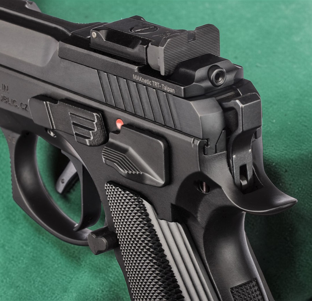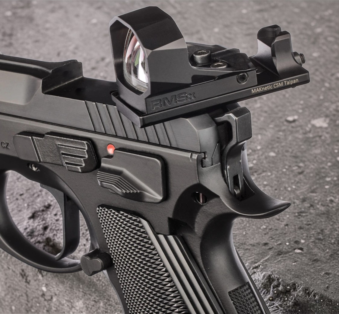 Das Besondere ist die Kombination der bewährten Taipan mit einem MAKnetic Reflexvisier-System, das den Wechsel von der offenen Visierung zum Rotpunktvisier zum Kinderspiel macht. Serienmäßig ist eine LPA-TRT Kimme bereits montiert. Im Lieferumfang sind unter Anderem drei Adapterplatten (für Shield, Trijicon RMR und Docter) enthalten. Durch das erhöhte Korn mit einer Höhe von 11,5 mm ist die Pro Tuning Taipan OR Co-Witness Ready. Der massive Dust Cover ist mit einer Schiene mit Picatinny Profil versehen, an der zum Beispiel Zusatzgewichte angebracht werden können.