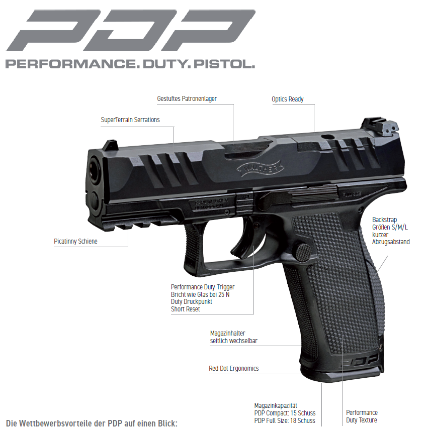„Best in Class“ Charakteristik: Der PDT Trigger bricht am Druckpunkt wie Glas bei 25 N. Voraussetzung für kontrolliertes Treffen. ▪ Herausragende Sicherheit: Perfektionierter Duty-Druckpunkt. Sichere Abzugsbeherrschung in jeder Situation. Kurzer Reset: Erlaubt gleichmäßige Top Performance. Von Schuss zu Schuss.